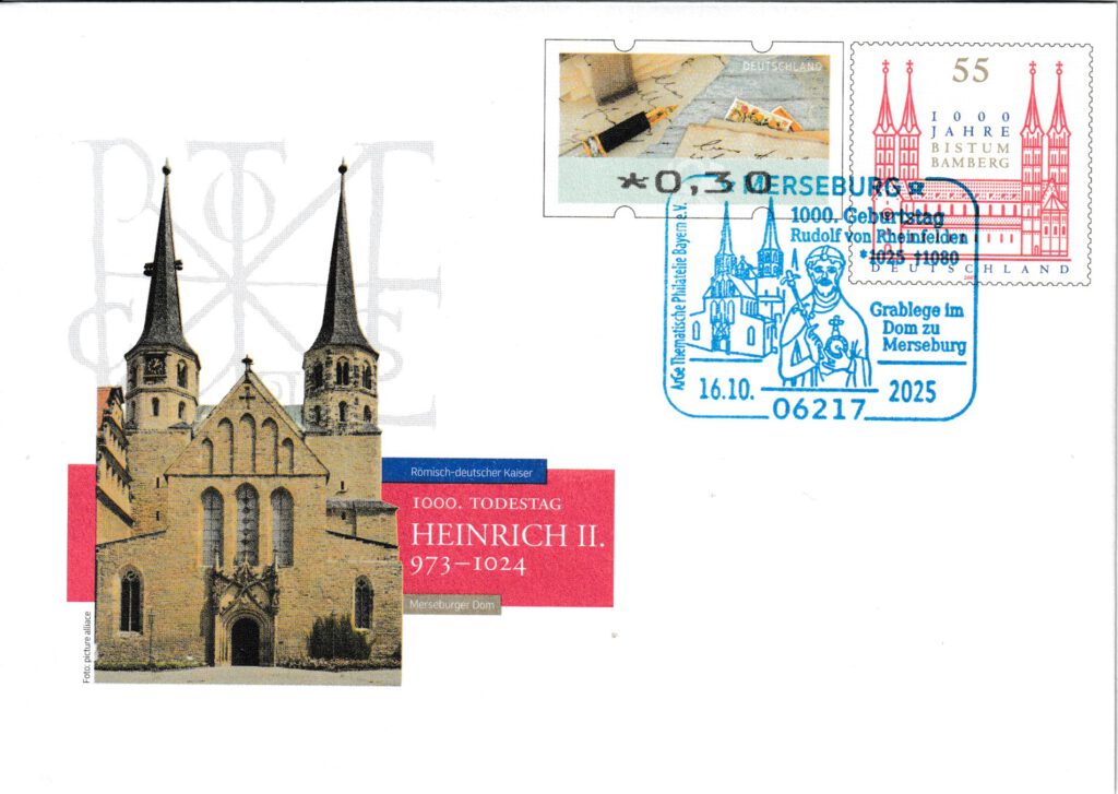 Anlässlich der 1000 Jahre Weihe des Merseburger Doms am 01. und 02.10.2021 befand sich das Event-Team Philatelie der Deutschen Post AG auf dem Merseburger Schlosshof mit einem Sonderstempel . Der Merseburger Briefmarkenverein 1898 e.V. hatte aus diesem Anlass zwei Schmuckumschläge vorbereitet. Der erste Schmuckumschlag zeigt die Mitra des Bischofs Friedrich II. von Hoym. Sie ist eine Leihgabe aus dem „Grünen Gewölbe“ Dresden. Der zweite Schmuckumschlag zeigt im Zudruck ein Detail aus dem Chorgestühl des Doms, welches das Stifterpaar Heinrich II. und Kunigunde mit dem Dom darstellt. Dazu wurden zwei Briefmarken INDIVIDUELL ausgeben, welche die Mitra und eine Domansicht zeigen.