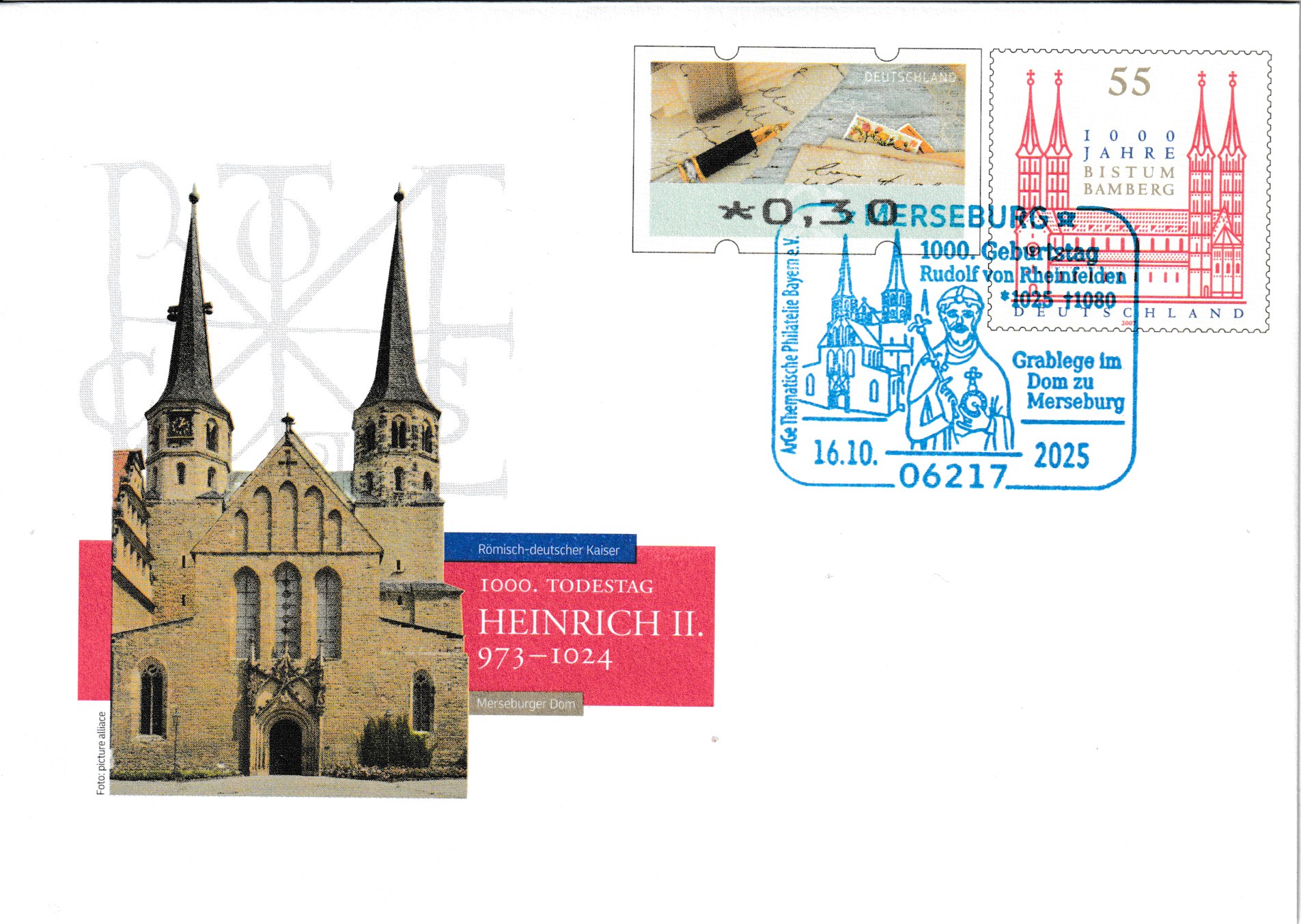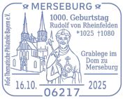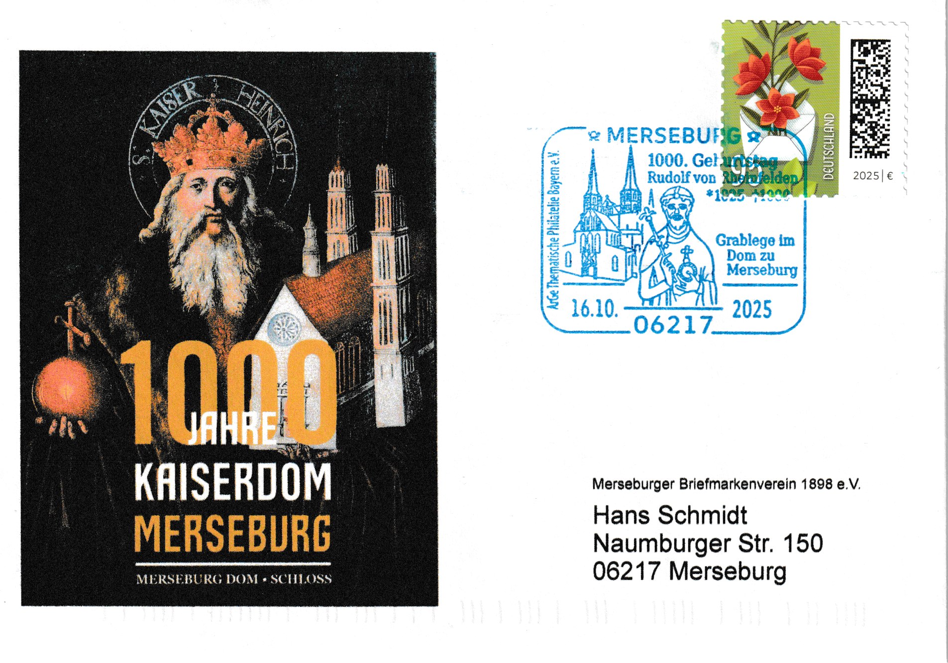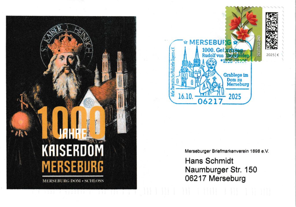 Die ArGe Thematische Philatelie Bayern e.V. hat anlässlich des 1000. Geburtstags Rudolf von Rheinfelden *1025 †1080, Gegenkönig Heinrichs IV, einen Sonderstempel kreiert. Nach seiner schweren Verwundung am 15. oder 16. Oktober 1080 in der Schlacht bei Hohenmölsen starb er einen Tag später an der schweren Unterleibsverletzung und wurde im Merseburger Dom aufgebahrt und bestattet. Das vermutlich von Werner von Merseburg in Auftrag gegebene Grabmal ist die älteste figürliche Grabplastik Mitteleuropas seit der Zeit der Römer. Sie zeigt Rudolf von Schwaben in voller Größe mitsamt Insignien wie Bügelkrone, Reichsapfel und Zepter.